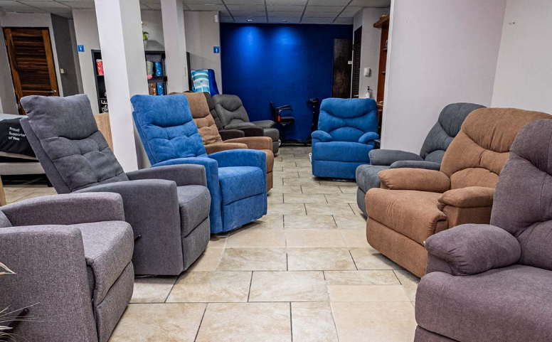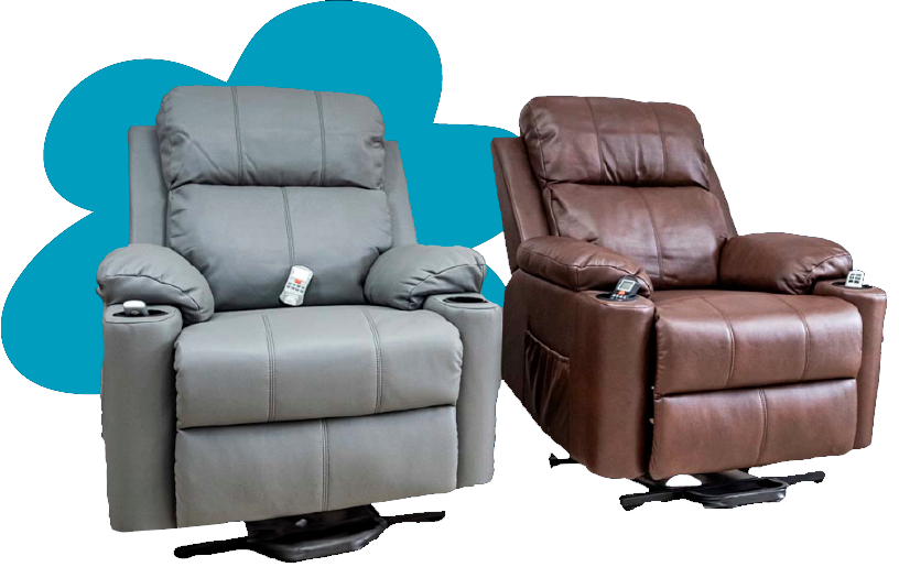 Butacas Lift Chair: reclinables que asisten a la persona para colocarse de pie, brindando libertad. Este sistema es eléctrico. Brindan calor, masaje terapéutico, 8 motores de masaje. Disponible en tela en varios colores y en piel: marrón, gris o negro.